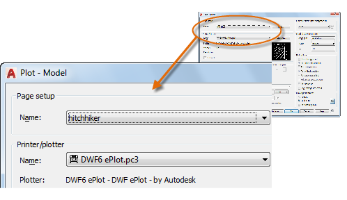 هنگامی که پلات شما آماده شد ، به سادگی نام page setup را در کادر محاوره ای Plot مشخص کنید و تمام تنظیمات پلات شما بازیابی خواهد شد. در تصویر زیر ، کادر محاوره ای Plot برای استفاده از page setup با نام Hitchhiker تنظیم شده است که یک فایل DWF (Web Design Format) را به جای چاپ با یک پلاتر، خروجی می دهد.