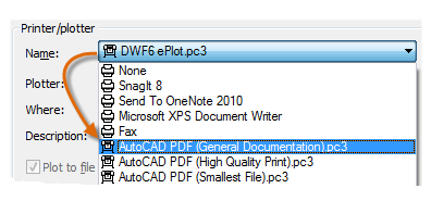 از لیست کشویی Print / Plotter ، گزینه AutoCAD PDF را انتخاب کنید (General Documentation).pc3 :