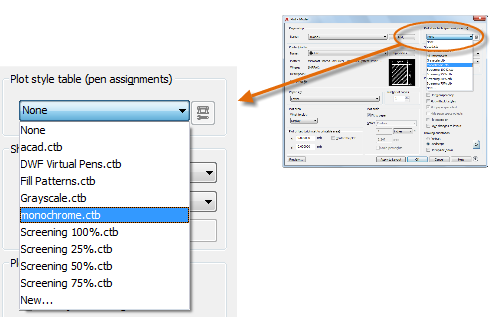 جدول plot style ، اطلاعاتی در مورد پردازش رنگ ها ارائه می دهد. رنگ هایی که در مانیتور شما خوب دیده می شوند ، ممکن است برای فایل PDF یا نسخه چاپی مناسب نباشند. برای مثال ، ممکن است بخواهید یک طراحی رنگی را ایجاد کنید ، اما خروجی تک رنگ داشته باشید. در اینجا نحوه تعیین خروجی تک رنگ آورده شده است:
