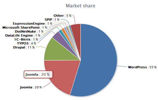 در آماری که اخیراً توسط W3Techs منتشر شده است ،میزان محبوبیت وردپرس (WordPress) ، به عنوان سیستم مدیریت محتوا (55٪) و Joomla (20٪) و Drupal (11٪) است.