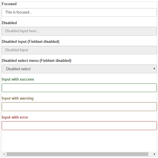 علاوه بر حالت focus: (یعنی ، یک کاربر بر روی ورودی یا زبانه های روی آن کلیک می کند) ، Bootstrap یک سبک بندی را برای ورودی ها و کلاس های غیر فعال جهت اعتبارسنجی فرم ارائه می دهد.
