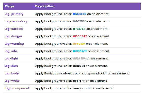در زیر کلاس های کمکی رنگ پس زمینه پشتیبانی شده را می بینید. این کلاس ها را می توانید هنگام افزودن رنگ پس زمینه استفاده کنید: