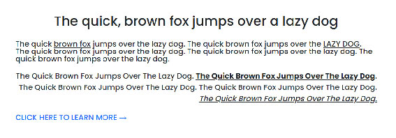 <p class="text-start lh-1">The quick <span class="text-lowercase text-decoration-underline">BROWN FOX</span> jumps over the lazy dog. The quick brown fox jumps over the <span class="text-uppercase text-decoration-underline">lazy dog</span>. The quick brown fox jumps over the lazy dog. The quick brown fox jumps over the lazy dog. The quick brown fox jumps over the lazy dog.</p>