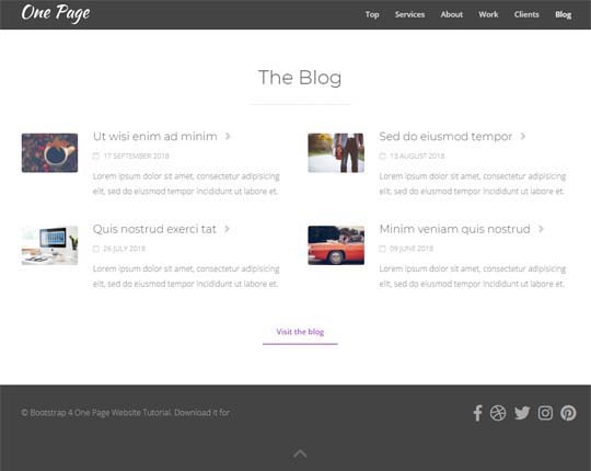 در این آموزش ما یک وب سایت تک صفحه ای با استفاده از Bootstrap 4 ایجاد خواهیم کرد. این صفحه دارای یک نوار ناوبری (منوی بالایی و لوگو) ، یک قسمت بالای صفحه ای با توضیحات و دکمه های اقدام ، بخش های خدمات و نمونه کارها ، بخش آخرین پست های وبلاگ ، بخش توصیه نامه و یک پاورقی ساده با نمادهای شبکه های اجتماعی است.