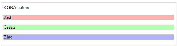 rgba ، مخفف عبارت red green blue alpha می باشد . در این روش رنگدهی شما مقدار رنگ های قرمز ، سبز ، آبی و مقدار آلفا را مشخص می کنید . برای مقادیر رنگی باید عددی بین 0 تا 255 را وارد کرد و برای مقدار آلفا باید عددی بین صفر تا 1 را انتخاب کرد . در مثال زیر نمونه ای از استفاده از این ساختار رنگی را می بینید .