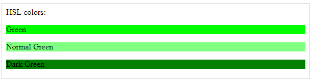 hsl ، مخفف عبارت hue saturation lightness می باشد . برای hue باید مقداری از صفر تا 360 و برای دو مقدار دیگر باید عددی بین صفر تا 100 درصد را وارد کرد . در ادامه نمونه ای از رنگدهی به این روش را مشاهده می کنید .