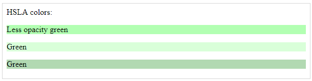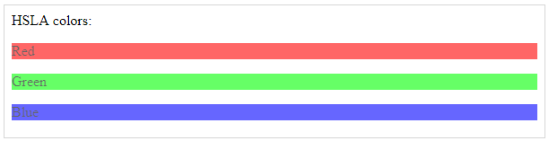 hsla ، مخفف عبارت hue saturation lightness alpha است . مقدار آلفا هر چه به صفر نزدیک تر شود ، تصویر شفاف تر ( کم رنگ تر ) می شود . در ادامه نمونه استفاده از این روش رنگدهی را مشاهده می کنید .