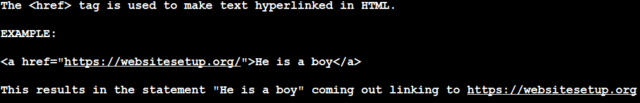 در کد HTML خام داریم : <a href=”https://websitesetup.org/”>He is a boy</a> که به صورت He is a boy نمایش داده می شود.