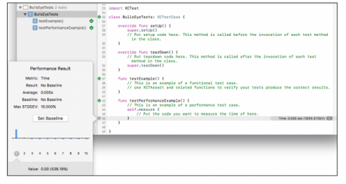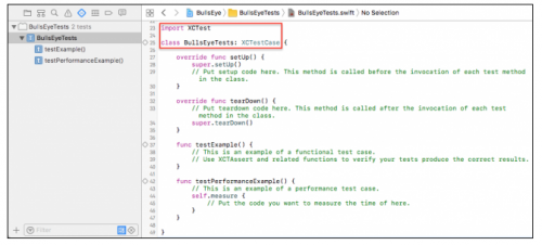 این قالب، XCTest را وارد می کند و یک زیر کلاس BullsEye Tests از XCTestCase با setup()، tearDown() و متدهای تست نمونه تعریف می کند.