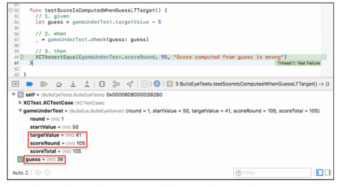 XCTAssertEqual(gameUnderTest.scoreRound, 95, "Score computed from guess is wrong")