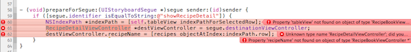 در حال حاضر، نمی توانیم اپ را اجرا کنیم. بعد از این که متد بالا را به داخل فایل RecipeBookViewController.m، کپی و paste نمودیم، چند خطا در برنامه مشاهده خواهیم کرد: