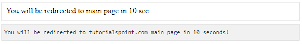 ما می توانیم قبل از این که بازدیدگان وب سایت خود را به یک صفحه جدید تغییر مسیر دهیم ، یک پیام مناسب را به آنان نمایش دهیم. تغییر مسیر نیاز به کمی زمان تأخیر (delay) برای لود صفحه جدید دارد. می توانیم این پیام را با بازدیدکنندگان نمایش دهیم. مثال زیر نحوه پیاده سازی این کار را نشان می دهد. در اینجا ، setTimeout() یک تابع جاوا اسکریپت داخلی می باشد که می تواند برای اجرای تابع دیگری بعد از یک زمان وقفه داده شده ، استفاده شود.