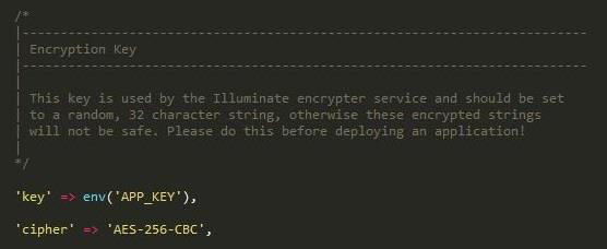 قبل از استفاده از سیستمِ رمزنگاری لاراول، باید در فایلِ پیکربندی config / app.php، مقادیر لازم برای رمزگذاری را وارد کنید.