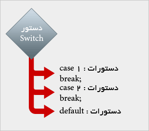 دستور Switch بدین صورت است که ابتدا یک مقدار می گیرد، و بین Case های خود که هر کدام مقداری دارند بررسی می کند که برابر با کدام است. اگر Case ی پیدا شد که مقدارش برابر با مقدار switch بود دستورات مربوط به آن Case اجرا می شود و بعد با رسیدن به دستور break از switch خارج می شود. ولی اگر case ی مطابق با مقدار switch پیدا نکرد، دستور default اجرا می گردد و این گونه دستور switch خاتمه پیدا می کند.