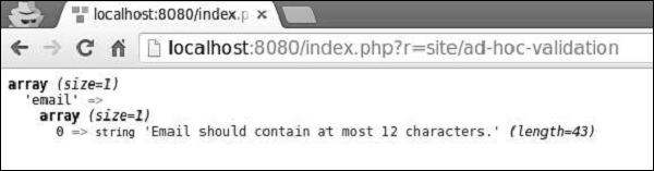 مرحله 2 - در نوار آدرس مرورگر وبتان به آدرس http://localhost:8080/index.php?r=site/ad-hoc-validation بروید، پیام خطایی را مشاهده خواهید کرد، زیرا ایمیل 14 کاراکتر دارد.