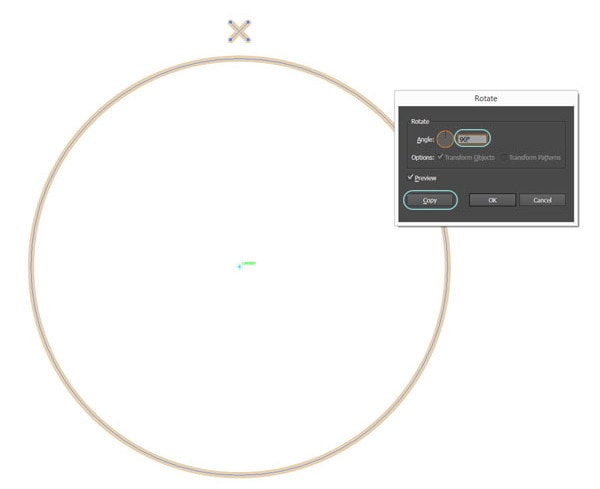- با انتخاب کراس، R + Alt را نگه دارید و مرکز دایره را بیابید ("مرکز" را مشاهده خواهید کرد) و روی صفحه کلیک کنید ، پنل Rotate ظاهر می شود. 90 درجه را پر کنید و روی Copy کلیک کنید. سپس روی Ctrl + D (تکرار عمل) کلیک کنید ، این کراس ها را در زاویه یکسان در اطراف دایره کپی می کند.