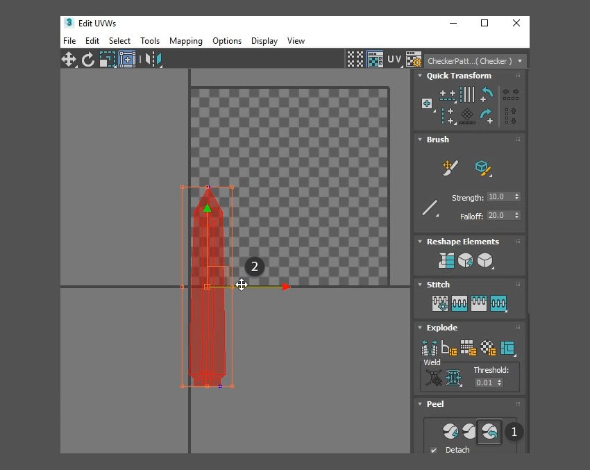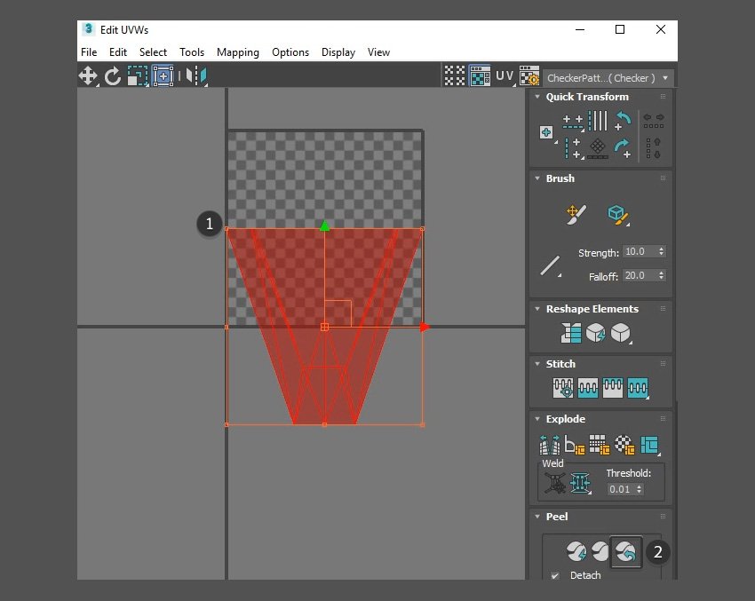 پنجره Edit UVSs ظاهر می شود. از ابزار Move و ابزار Scale واقع در بالا سمت راست پنجره، برای جابجایی شی در داخل مربع استفاده کنید. وقتی شیء در مربع قرار گرفت، روی دکمه Reset Peel کلیک کنید.