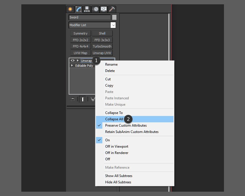 پنجره Edit UVWs را ببندید. مطمئن شوید که تیغه انتخاب شده است و به برگه Modify بروید. روی Unwrap Modifier راست کلیک کرده و Collapse All را انتخاب کنید.