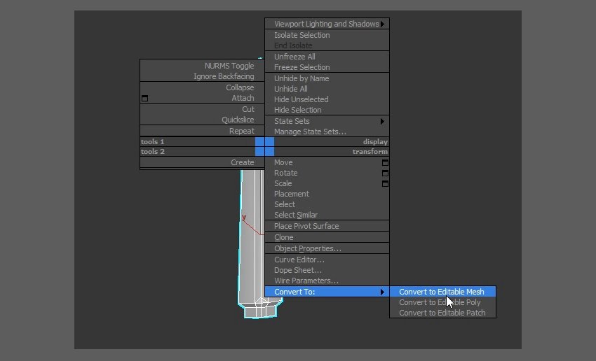 اطمینان حاصل کنید که قسمت شمشیر را که می خواهید باز کنید، (تیغه ، دسته ، محافظ دست و غیره) را انتخاب کرده باشید. اکنون شیء باید به مش قابل ویرایش تبدیل شود. برای انجام این کار، روی شی راست کلیک کرده و Convert to Editable Mesh را انتخاب کنید.
