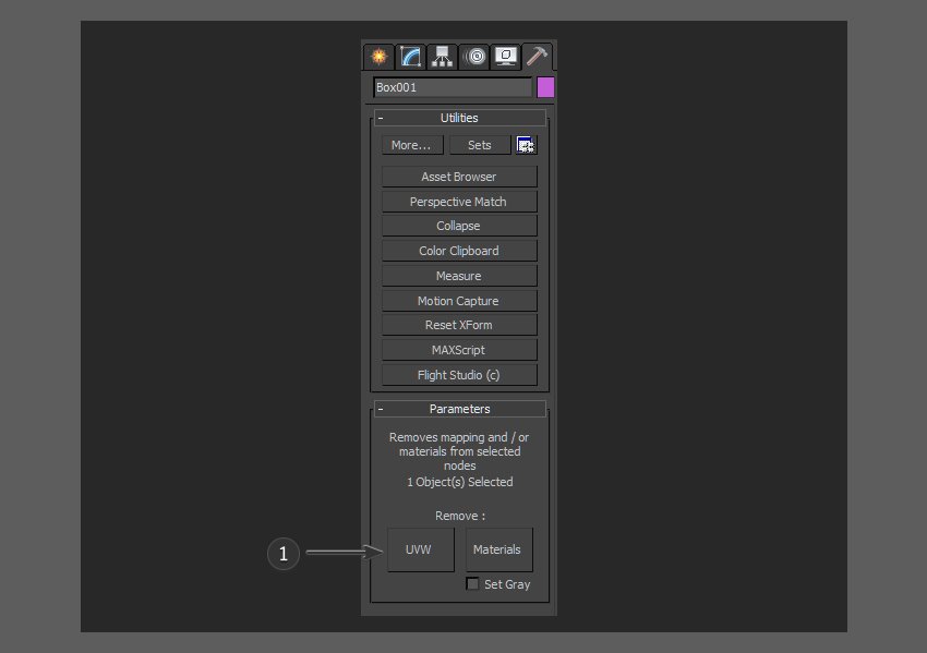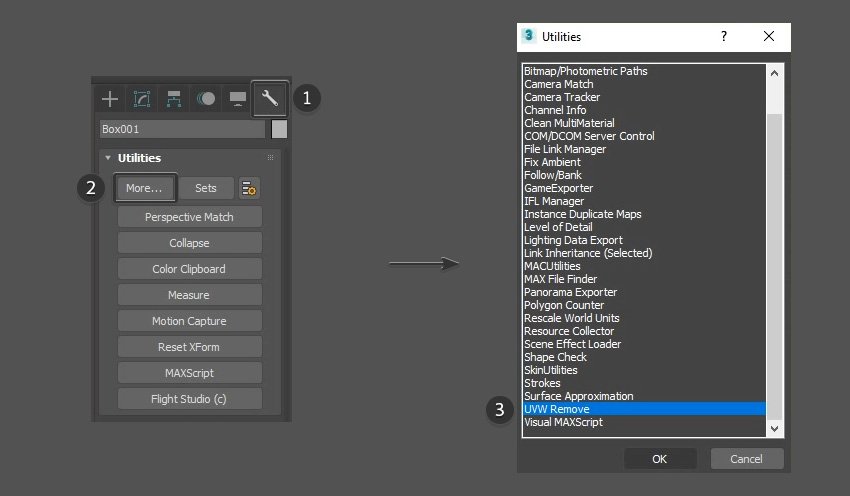 سپس به برگه Utilities بروید و روی دکمه More کلیک کنید. منو را پایین بیاورید و UVW Remove را انتخاب کنید.