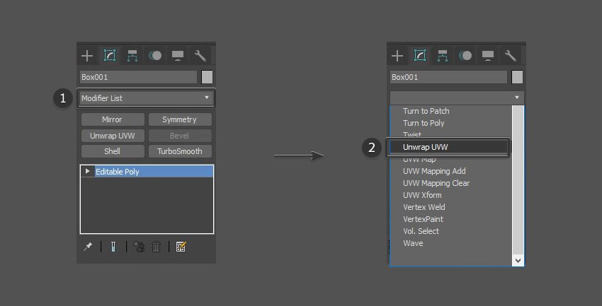 به منوی کشویی Modifier List رفته و Unwrap UVW را انتخاب کنید.
