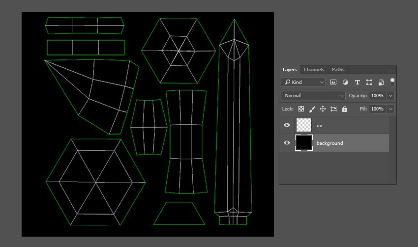 نقشه UV را در فتوشاپ وارد کنید و یک لایه پس زمینه جدید در زیر اشعه ماوراء بنفش ایجاد کنید.