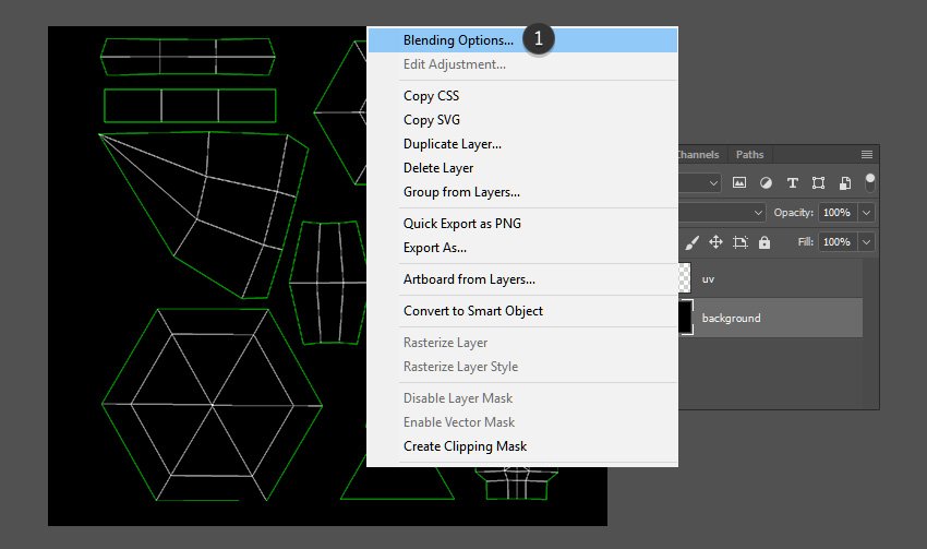 با تغییر رنگ خطوط، می توانید اشعه ماوراء بنفش را آسان تر کنید. برای انجام این کار ، روی لایه UV کلیک راست کرده و Blending Options را انتخاب کنید.