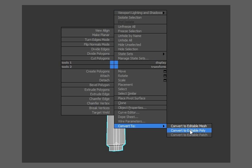 هنگامی که UVW Remove اعمال شد، روی شی، راست کلیک کرده و Convert to Editable Poly را انتخاب کنید.