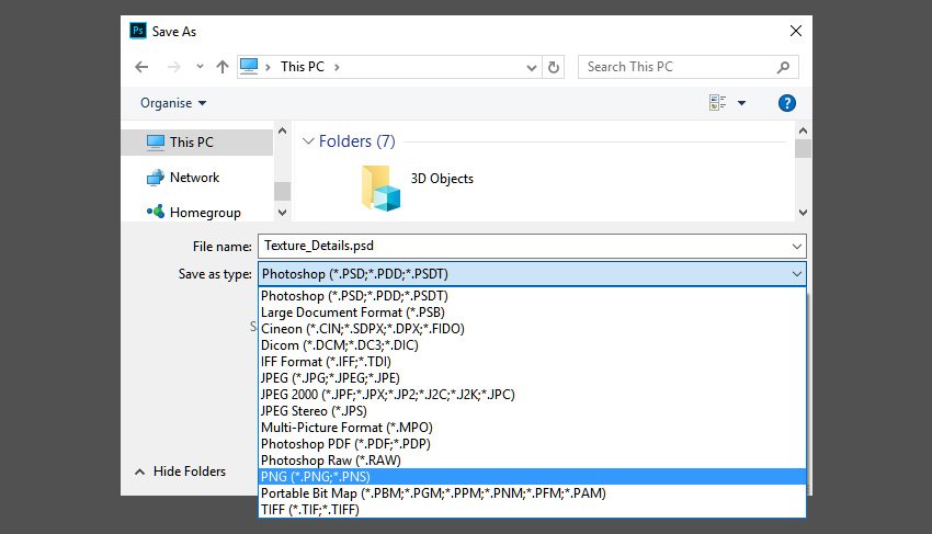 تصویر Texture Map را که در Adobe Photoshop ایجاد شده است، انتخاب کنید.