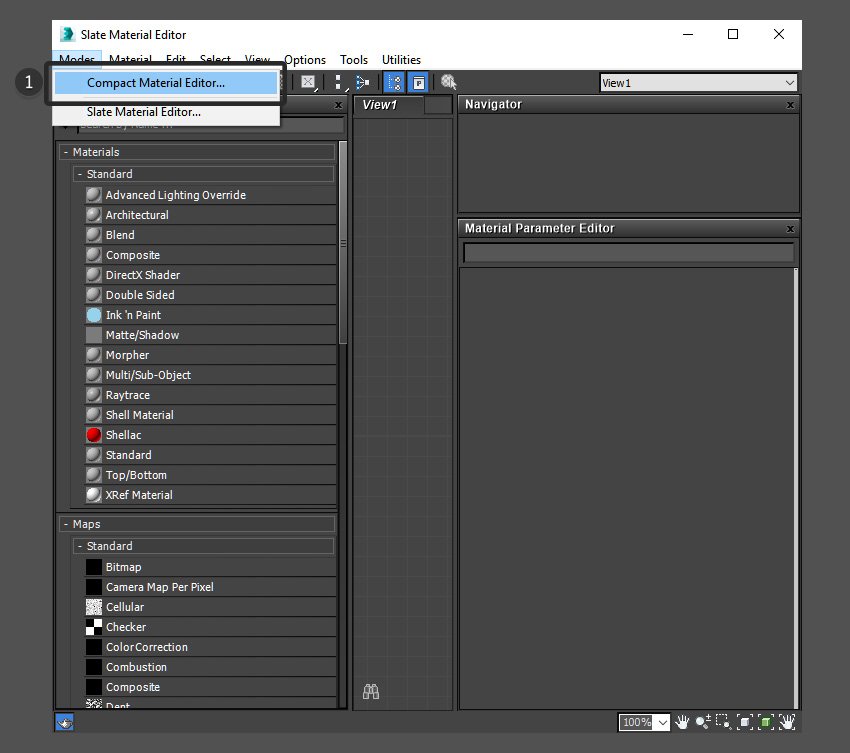 پس از ظاهر شدن پنجره Material Editor به Mode> Compact Material Editor بروید.