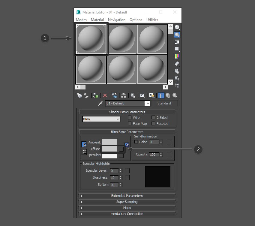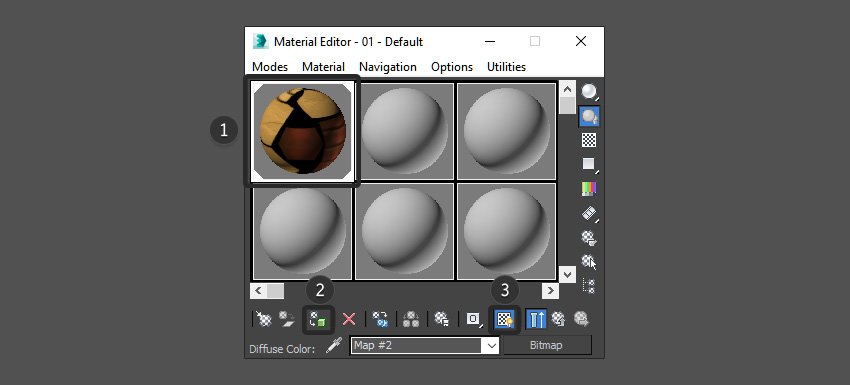 یکی از spheres هایی را که می خواهید texture map روی آن ظاهر شود، انتخاب کنید و سپس روی کادر خالی کنار Diffuse کلیک کنید.