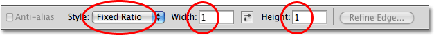 هر زمان کهRectangular Marquee انتخاب شود ، نوار Options در بالای صفحه ، گزینه های مخصوص این ابزار را نشان می دهد. یکی از این گزینه ها ، Style نامیده می شود و به طور پیش فرض بر روی Normal تنظیم شده است. این بدان معناست که ما می توانیم انتخاب خود را با هر ابعادی بکشیم. برای کشیدن انتخاب مربعی شکل ، ابتدا گزینه Style را به Fixed Ratio تغییر می دهیم. سپس مقدار 1 را برای عرض و ارتفاع وارد می کنیم (1 مقدار پیش فرض عرض و ارتفاع است ؛ بنابراین ممکن است نیازی به تغییر آن نباشد) :