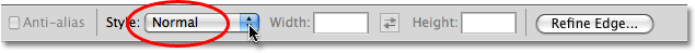 تنها مشکلی که در استفاده از این روش برای انتخاب یک مربع وجود دارد ، این است که مقادیر گزینه ها در نوار Options "ماندگار" هستند. بدین معنی که دفعه بعد که شما بخواهید از این ابزار استفاده کنید ، به طور خودکار به تنظیمات پیش فرض خود باز نمی گردد. شما سعی می کنید یک انتخاب مستطیلی شکل را بکشید ، اما انتخاب به صورت یک مربع ترسیم می شود ؛ زیرا فراموش کرده گزینه Style را به حالت عادی تغییر دهید. بنابراین ، قبل از ادامه کار ، بیایید هم اکنون آن را به حالت عادی تغییر دهیم: