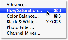 برای تغییر رنگ بلوک ، از قسمت تنظیم تصویر گزینه Hue / Saturation فتوشاپ استفاده خواهیم کرد. برای انتخاب آن ، به منوی Image در بالای صفحه می رویم و بخش Adjustments و سپس Hue / Saturation را انتخاب می کنیم: