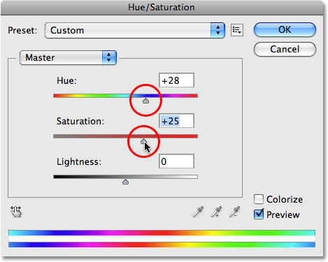 با این کار ، کادر محاوره ای Hue / Saturation نمایش داده می شود. بیایید رنگ بلوک را به نارنجی تغییر دهیم. تغییر رنگ به آسانی کشیدن لغزنده Hue به چپ یا راست است تا زمانی که رنگ مورد نظر خود را پیدا کنید. ما آن را به سمت راست می کشیم تا روی مقدار 28 تنظیم شود و رنگ نارنجی انتخاب شود. سپس ، برای اینکه مقدار اشباع رنگ را کمی بالا بیاوریم ، نوار لغزنده Saturation را به سمت راست می کشیم و مقدار آن را در حدود مقدار 25+ قرار می دهیم: