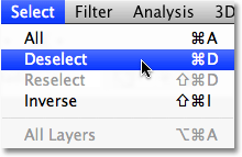 وقتی از رنگ جدید راضی شدیم ، روی OK کلیک می کنیم تا از کادر محاوره ای خارج شویم. دیگر به انتخاب خود نیازی نداریم ، بنابراین برای حذف آن ، به منوی Select در بالای صفحه می رویم و گزینه Deselect را انتخاب می کنیم: