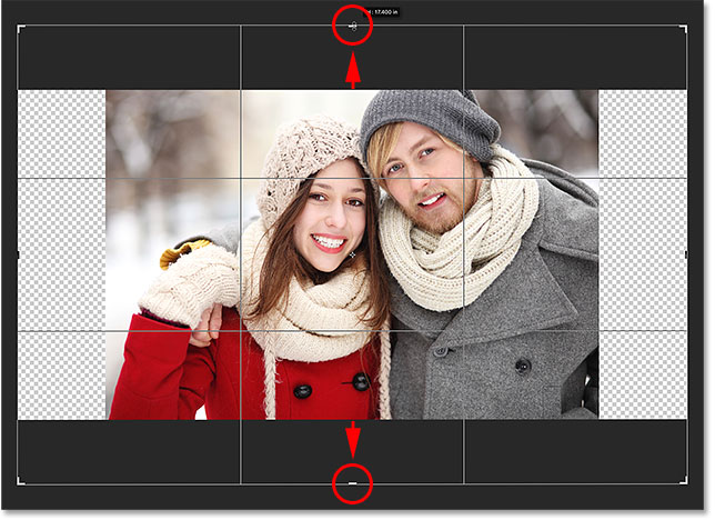 هم چنین می توانیم فضای اضافی را در قسمت بالا و پایین تصویر اضافه کنیم. برای افزودن فضا در قسمت بالا ، دسته بالا را کلیک کرده و به سمت بالا بکشید. برای افزودن فضا در قسمت پایین ، دسته پایین را کلیک کرده و به سمت پایین بکشید.