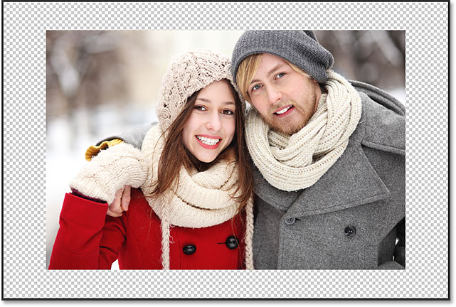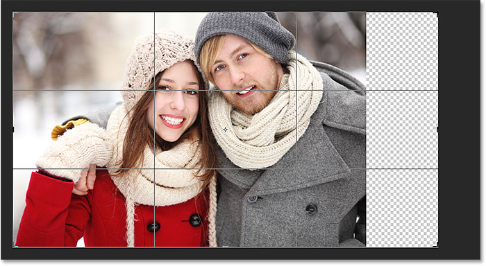 وقتی کلید ماوس را رها می کنیم ، فتوشاپ فضای اضافی را به بوم تصویر ما اضافه می کند و آن را با الگوی شطرنجی پر می کند. الگوی شطرنجی نمایش داده شده ، به این معنی است که فضای اضافی اطراف تصویر ، در حال حاضر خالی است. در ادامه ما این مشکل را نیز رفع خواهیم کرد:
