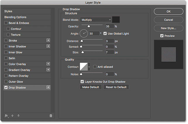 هم چنین می توانید با کشیدن نوار لغزنده Opacity ، میزان روشنی یا تار بودن سایه را کنترل کنید ، اما ما تنظیمات مثال خود را روی مقدار پیش فرض 35٪ قرار می دهیم: