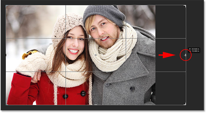 برای افزودن فضای اضافی به دور تصویر ، تنها کاری که باید انجام دهیم کلیک کردن بر روی دسته ها و کشیدن آنها به سمت خارج است. سپس فتوشاپ اندازه بوم را متناسب با اندازه جدید حاشیه برش گسترش می دهد.