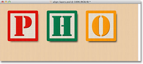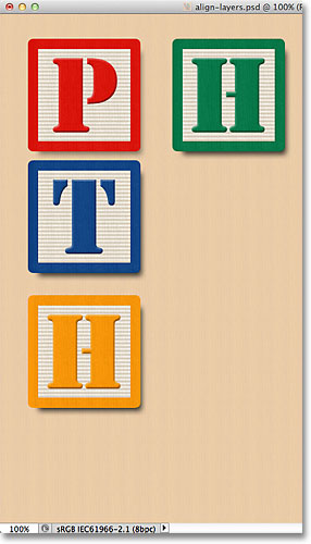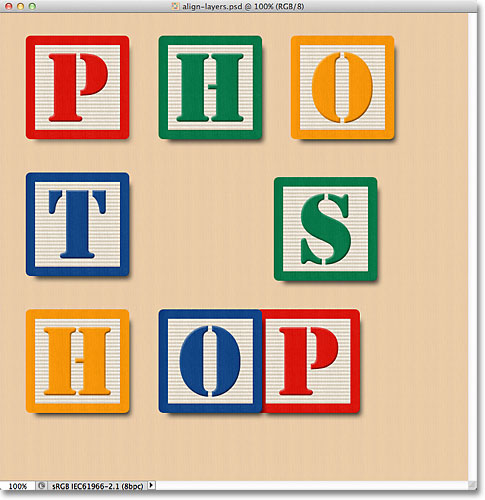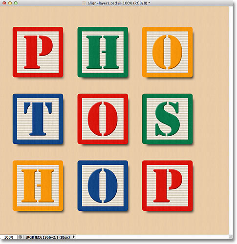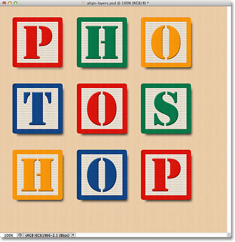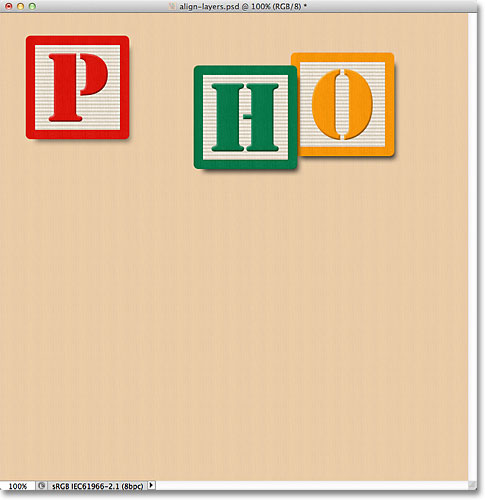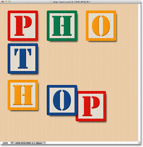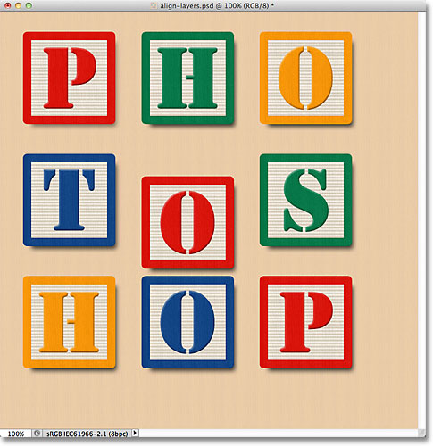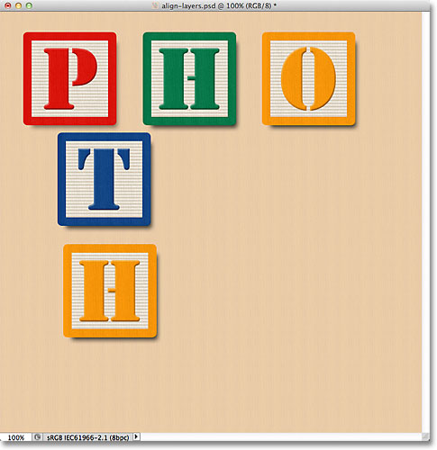 حال چگونه می توانیم بلوک های داخل سند را مرتب کرده و با یکدیگر هم ردیف کنیم؟ خوب ، ما می توانیم سعی کنیم آنها را به صورت دستی با استفاده از ابزار Move حرکت داده و مرتب کنیم. اما این کار زمان بر است و از طرفی شک داریم که بتوانیم همه آنها را به طور کامل به صورت چشمی در یک ردیف قرار دهیم. یک راه بهتر ، و یک روش بسیار آسان تر ، این است که به فتوشاپ اجازه دهیم کار را خودش با استفاده از گزینه های Align و Distribute به صورت خودکار انجام دهد!