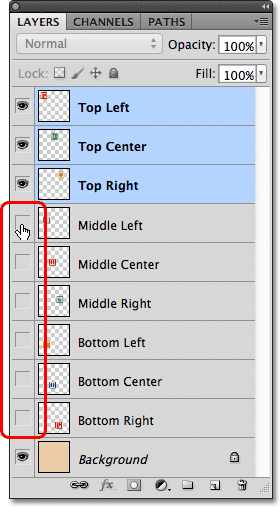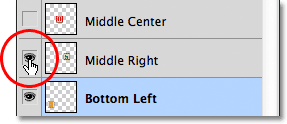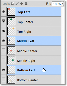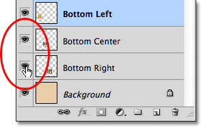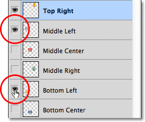 با در اختیار داشتن سه لایه بالا ، بر روی آیکون های قابلیت مشاهده لایه های Middle Left و Bottom Left در پنل Layers کلیک می کنیم تا روشن شوند: