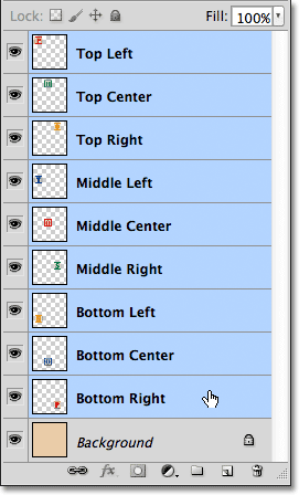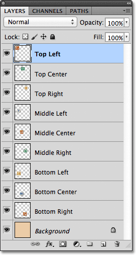 در حال حاضر ، بلوک ها در همه نقاط سند پراکنده شده اند. اما آن چه که ما می خواهیم انجام دهیم ، این است که آنها را به صورت یک الگوی شبکه ای 3*3 مرتب کنیم. اگر به پنل Layers ما نگاه کنید ، می بینید که هر بلوک روی لایه خود بر روی بالای لایه Background نشسته است. ما کار را پیش برده و هر لایه را بر اساس مکانی که می خواهیم هر بلوک در شبکه ظاهر شود ، تغییر نام داده ایم ("Top Left " ، "Top Right ، "Bottom Right" و غیره):