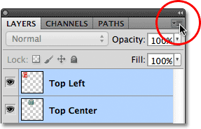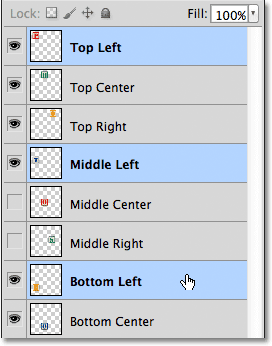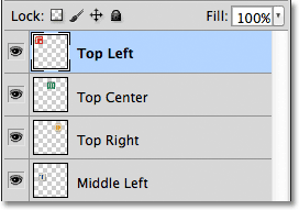 بیایید ببینیم اگر چند لایه را انتخاب کنیم ، چه اتفاقی می افتد. در حال حاضر ، لایه Top Left را در بالای پشته لایه انتخاب کرده ایم: