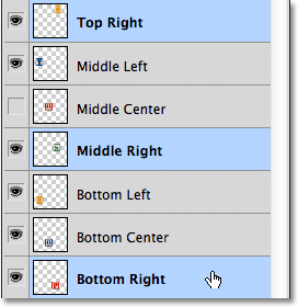 قصد داریم لایه های Bottom Center و Bottom Right را با کلیک روی آیکون های قابلیت مشاهده ، روشن کنیم: