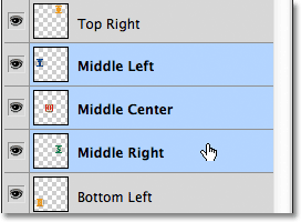 بلوک مرکزی باید با بلوک های دو طرف همسو شود ؛ بنابراین ، لایه های Middle Left ، Middle Center و Middle Right را در پنل Layers انتخاب می کنیم:
