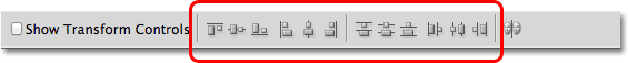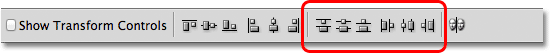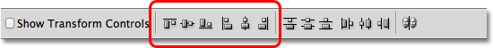 شش آیکون اول در ردیف گزینه های Align هستند. از چپ به راست ، Align Top Edges ، Align Vertical Centers ، Align Bottom Edges ، Align Left Edges ، Align Horizontal Centers و Align Right Edges را داریم. این گزینه ها ، محتویات دو یا چند لایه را بر اساس لبه های محتوا یا مراکز محتواهای دیگر قرار می دهند: