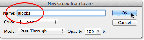 فتوشاپ با باز کردن یک کادر محاوره ای ، از ما نامی برای گروه لایه جدید می خواهد. نام آن را “Blocks" می گذاریم ، سپس روی کلید OK کلیک می کنیم تا کادر محاوره ای بسته شود: