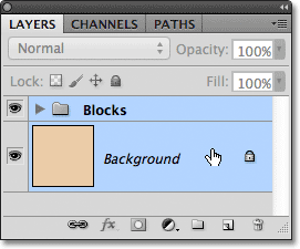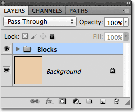 یکی از نکات خوب در مورد گروه های لایه ، علاوه بر این که راهی عالی برای تمیز و منظم نگاه داشتن پنل Layers ما هستند ، این است که آنها به ما امکان می دهند همه لایه های داخل آنها را به صورت تک لایه حرکت دهیم. گروه Blocks قبلاً در پنل Layers انتخاب شده است ، بنابراین وقتی روی لایه Background زیر آن کلیک می کنیم ، کلید Shift را پایین نگه می داریم. با این کار هم گروه لایه و هم لایه Background یک باره انتخاب می شوند: