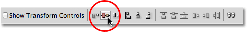 هم چنین ، ما باید سه بلوک را به طور مساوی از یکدیگر قرار دهیم ؛ بنابراین روی گزینه Distribute Vertical Centers در نوار Options کلیک می کنیم ، دقیقاً همان طور که فاصله سه بلوک را در سمت چپ تنظیم کردیم: